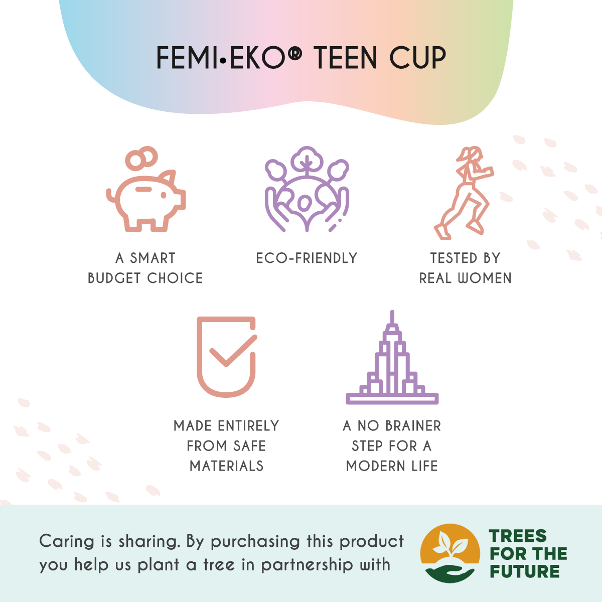 Viele Mädchen im Teenageralter bevorzugen keine Tampons, weil sie das Risiko von Reizungen und Unwohlsein mit sich bringen. Die Femi.Eko® Menstruationstasse TEEN ist eine gesündere und bequemere Alternative, die das natürliche Gleichgewicht unterstützt und Scheidentrockenheit verhindert.