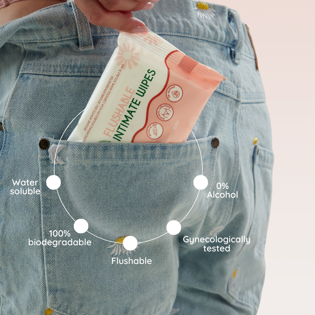 • Biologisk nedbrydelige intime vådservietter – perfekte til hurtig friskhed.